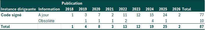 - Et pour aller plus loin dans cette analyse, ont été observés la concordance entre le signataire du code et la direction actuelle du Groupe concerné. Là encore quelques efforts devraient être produits dans de rares cas, où le code, sans trop de surprise, a été publié plus de 3 ans auparavant.