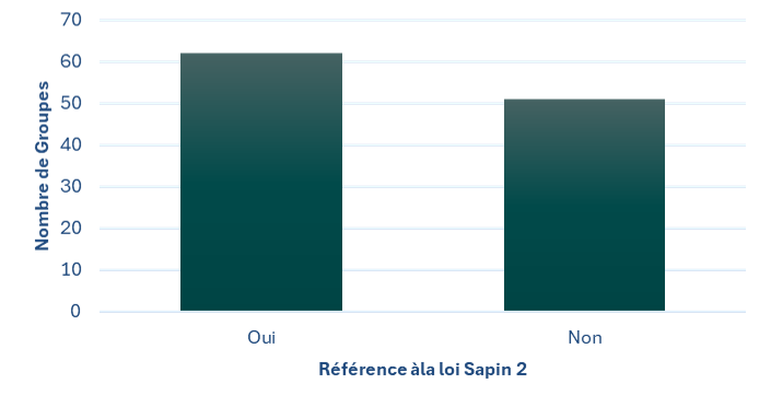 - Enfin, le code de conduite anticorruption étant une exigence propre à la loi Sapin 2, et permettant finalement d’assurer à son lecteur, qu’il avait été rédigé pour les besoins de la loi, il est apparu sinon utile, au moins instructif de savoir combien de Groupes y faisaient expressément référence. 62 seulement sur les 113 mentionnent la loi. La mention n’étant ni obligatoire, ni franchement utile, cette proportion n’est pas surprenante.